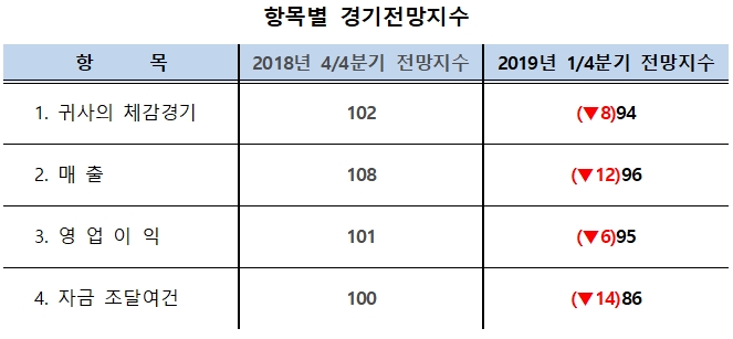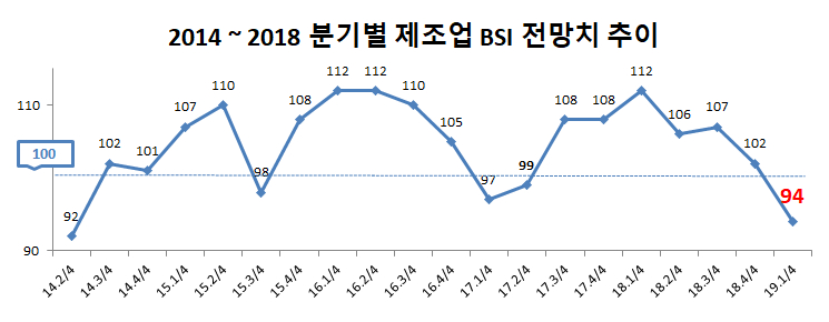 ¡à Á¦ÁÖ»ó°øÈ¸ÀǼÒ(ȸÀå ±è´ëÇü)´Â ¡°ÃÖ±Ù µµ³» 95°³ Á¦Á¶¾÷üÀÇ ÀÀ´äÀ» Áß½ÉÀ¸·Î ¡®2019³â 1/4ºÐ±â ±â¾÷°æ±âÀü¸ÁÀ» Á¶»çÇÑ °á°ú, BSI(±â¾÷°æ±âÀü¸ÁÁö¼ö, ±âÁØÄ¡=100)´Â 8p Ç϶ôÇÑ 94P ·Î 2014³â 2/4ºÐ±â(92p) ÀÌ·¡·Î °¡Àå ³·Àº Æ÷ÀÎÆ®¸¦ ³ªÅ¸³», ¿ÃÇØ °æ±âȸº¹À» À§ÇÑ Àû±ØÀûÀÎ °æ±âºÎ¾çÃ¥ÀÌ Àý½ÇÈ÷ ¿ä±¸µÈ´Ù.¡±°í ¹àÇû´Ù.