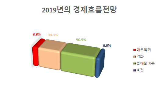 ¡à 2019³âÀÇ °æÁ¦ È帧Àº ¾î¶°ÇÒ °ÍÀ¸·Î Àü¸ÁÇÏ´ÂÁö ¹¯´Â Áú¹®¿¡ ¡°¸Å¿ì¾ÇÈ(8.8%)¡±¡°¾ÇÈ(34.1%)¡±·Î 42.9%ÀÀ´äÀÚ°¡ ¿ÃÇØ °æ±âÀü¸ÁÀ» ºÎÁ¤ÀûÀ¸·Î ´äº¯À» ÇÏ¿´°í, ¡°¿ÃÇØ¿Í ºñ½Á(50.5%)¡±, ¡°È£Àü(6.6%)¡± À¸·Î °¢°¢ ÀÀ´äÇß´Ù.