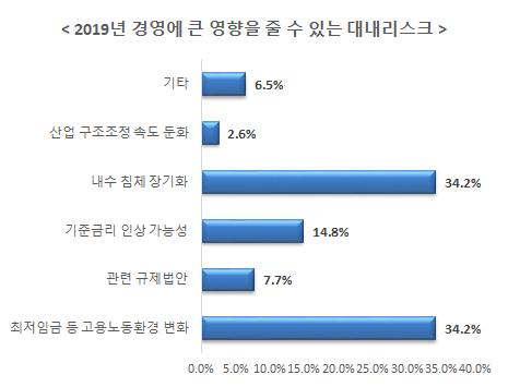 ¡à 2019³â °æ¿µ¿¡ Å« ¿µÇâÀ» ÁÙ ¼ö ÀÖ´Â ´ë³»¸®½ºÅ©¸¦ ¹¯´Â Áú¹®¿¡ ¡°³»¼ö ħü Àå±âÈ(34.2%)¡±¿Í ¡°ÃÖÀúÀÓ±Ý µî °í¿ë³ëµ¿È¯°æ º¯È(34.2%)¡±¶ó°í ÀÀ´äÇÑ ±â¾÷ÀÌ °¡Àå ¸¹¾Ò°í ¡°±âÁرݸ® ÀÎ»ó °¡´É¼º(14.8%)¡±, ¡°°ü·Ã ±ÔÁ¦¹ý¾È(7.7%)¡±, ¡°»ê¾÷ ±¸Á¶Á¶Á¤ ¼Óµµ µÐÈ(2.6%)¡± ¼øÀ¸·Î ÀÀ´äÇß´Ù.