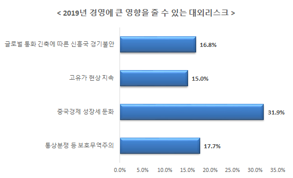 ¡à 2019³â °æ¿µ¿¡ Å« ¿µÇâÀ» ÁÙ ¼ö ÀÖ´Â ´ë¿Ü¸®½ºÅ©¸¦ ¹¯´Â Áú¹®¿¡ ¡°Áß±¹°æÁ¦ ¼ºÀå¼¼ µÐÈ(31.9%)¡±·Î ÀÀ´äÇÑ ±â¾÷ÀÌ °¡Àå ¸¹¾Ò°í ¡°Åë»óºÐÀï µî º¸È£¹«¿ªÁÖÀÇ(17.7%)¡±, ¡°±Û·Î¹ú ÅëÈ ±äÃà¿¡ µû¸¥ ½ÅÈï±¹ °æ±âºÒ¾È(16.8%)¡±, ¡°°íÀ¯°¡ Çö»ó Áö¼Ó(15.0%)¡± ¼øÀ¸·Î ÀÀ´äÇß´Ù.